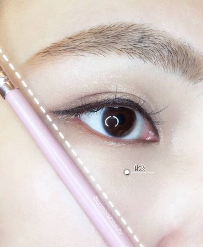 先把眼尾拉平约0.5cm再向上约侧斜20-30度孤度约1-1.5cm! 因为我眼睛比例比较长,所以我只拉长约0.8-1cm啊[萌萌哒R]!更准确的长度看下一个步骤4。