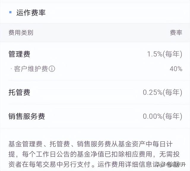 基金管理费:是投资者支付给基金管理人员的报酬。股票型和偏股型基金一般为1.5%,债券型和货币型基金的管理费用一般较低,大致在0.5%左右。