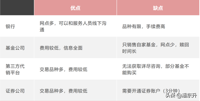 总体来说,基金公司只能购买自己家的基金,不便于集中持仓和管理查看;银行渠道手续费较贵,但是有线下服务;证券公司和第三方代销平台网上开户即可买卖,用户体验更好,费用也更低。我个人主要是在证券app内购买基金,比较方便管理。