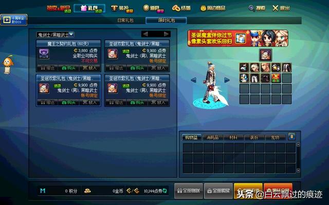 前两年还在坑的时候,对这游戏充值挺厉害的,一直没什么时间玩游戏后就把大号卖了,也退坑了大半年,结果还是被朋友邀请的再次入坑了,再次创建角色是还是忍不住的充值了好几百作为游戏资本,然后中途也充值了不少,深渊装备死活不齐,于是就把第一个角色删除了,改玩小号,然后一直玩到现在。说不再怼着游戏充值也不真实,看心情多多少少的充值一些吧。游戏更新后出了圣诞套,需要9900点券一个,差不多100块钱一套,算起来可说便宜可说很贵,这个礼包出来后,那些土豪那是放肆的大买特买,感觉不要钱似的。没毕业的我是什么礼包也不会买的。