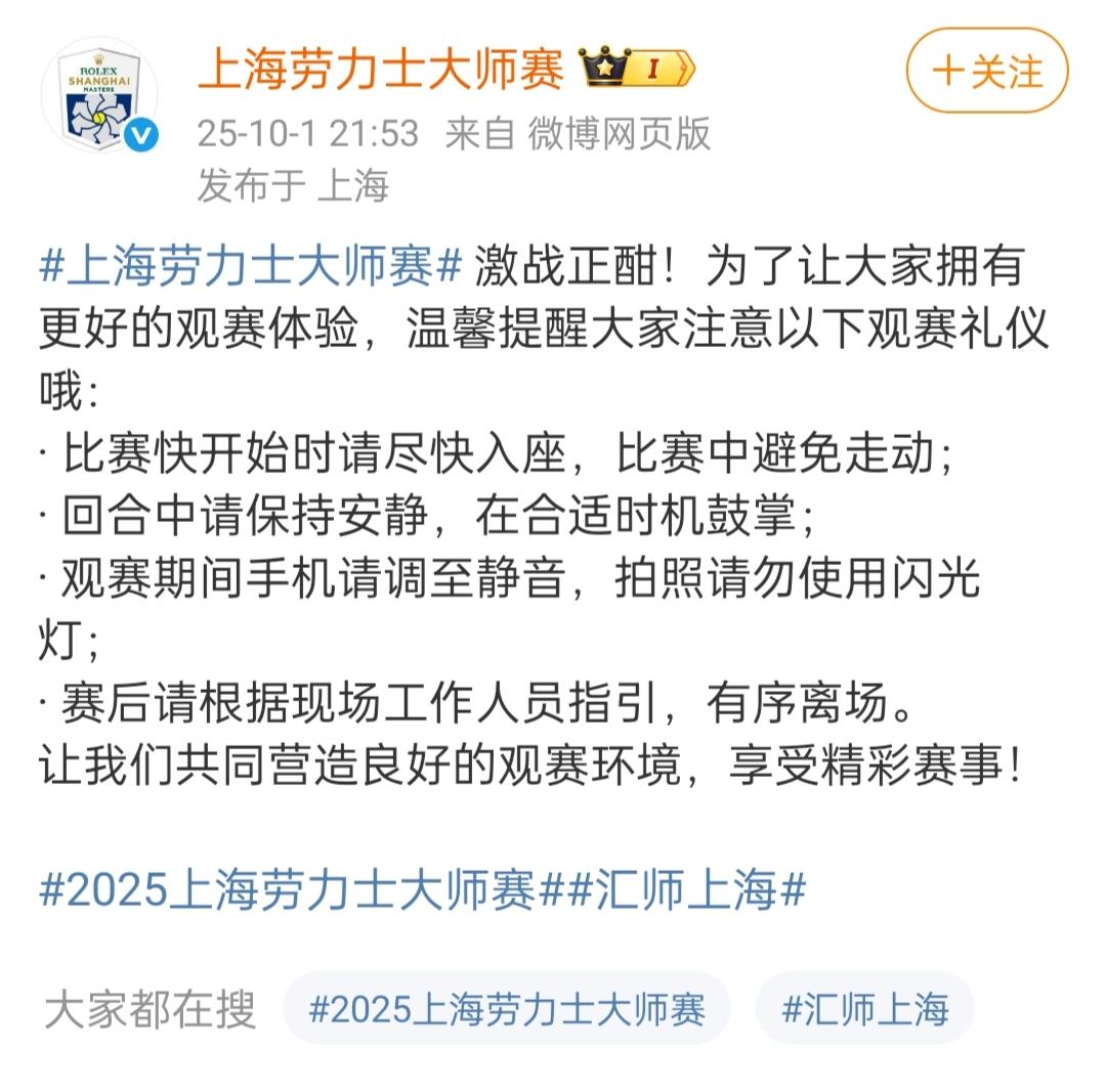 上海劳力士大师赛官方账号发文,提醒营造良好观赛环境。
