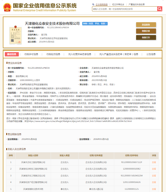 国家企业信用信息公示系统显示,天津渤化众泰安全技术股份有限公司成立于2016年,注册资本1000万元人民币,法定代表人为曹文艳,大股东为北京帮安迪信息科技股份有限公司。