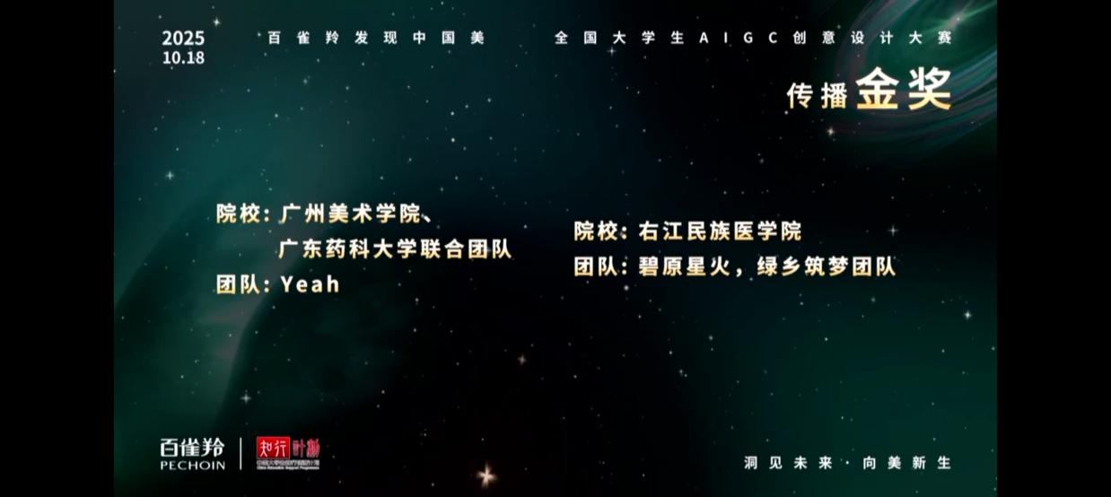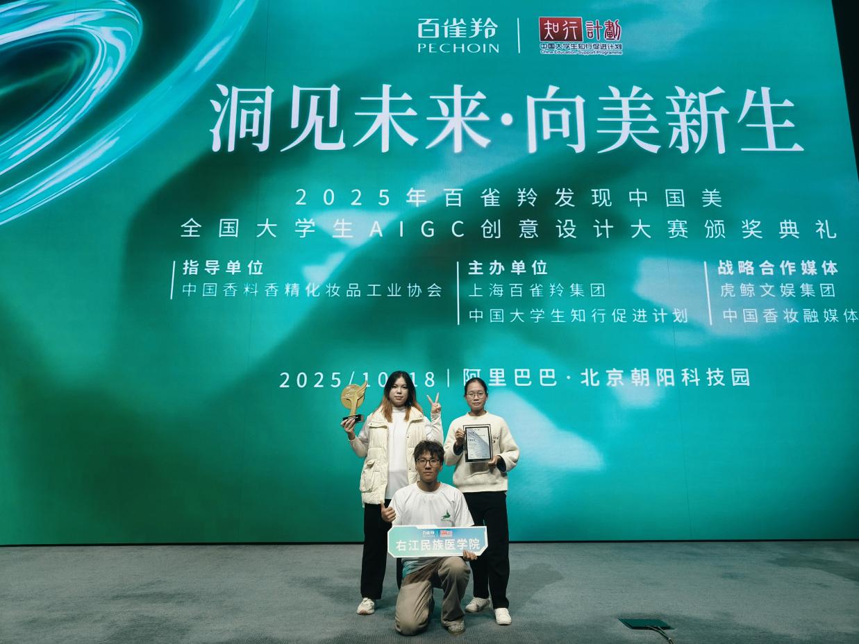 近日,由百雀羚集团与中国大学生知行促进计划联合主办、中国香料香精化妆品工业协会指导的“百雀羚发现中国美|全国大学生AIGC创意设计大赛”正式落下帷幕。广西百色右江民族医学院“碧原星火,绿乡筑梦”团队凭借其鲜明的创作特色与出色的传播成效,从全国200余所高校、700多名青年学子中脱颖而出,一举斩获大赛传播金奖。
