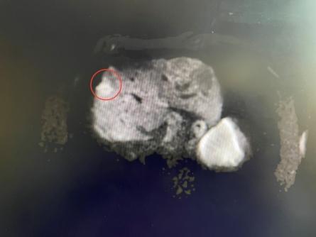 为破解这一难题,姜文进和团队决定启用“水隔离”技术。手术中,在CT实时引导下,姜雨田主治医师先将极细穿刺针精准刺入肿瘤与膈肌的微小间隙;考虑到肿瘤位置较高,常规注入生理盐水易流失,姜文进副主任医师创新采用“置管喷洒冰水”方案,在需保护的膈肌区域留置导管,持续喷洒冰水,形成一道“水循环护城河”;最终,消融针在隔离带保护下直达肿瘤内部释放能量,流动的冰水如同“内置冷却系统”,既实现肿瘤从内到外的彻底消融,又将膈肌温度控制在安全范围,全程无任何脏器损伤。