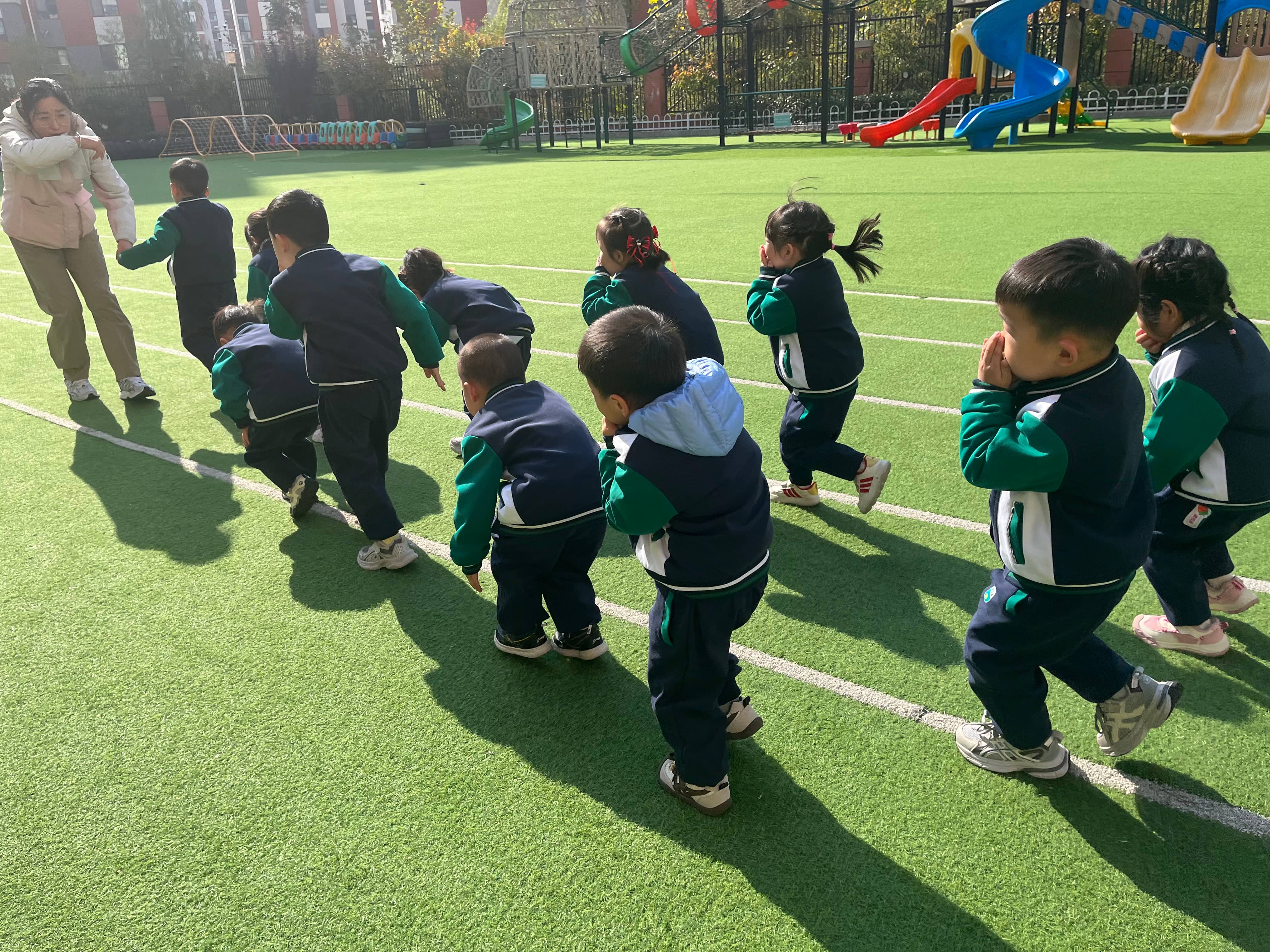 最让孩子们兴奋的当属消防演练环节。随着警报声响起,在消防员和老师的引导下,小班萌娃们用小手捂住口鼻,弯着腰,像小企鹅一样有序地从教室撤离到操场安全区域。集合后,消防员叔叔没有直接说教,而是拿起灭火器现场演示:“一提、二拔、三握、四压,这四个步骤就像给灭火器‘挠痒痒’,它就能喷出灭火泡沫啦!”同时还叮嘱全体师生,遇到火灾要保持冷静,记住逃生路线,不贪恋财物、玩具和零食。