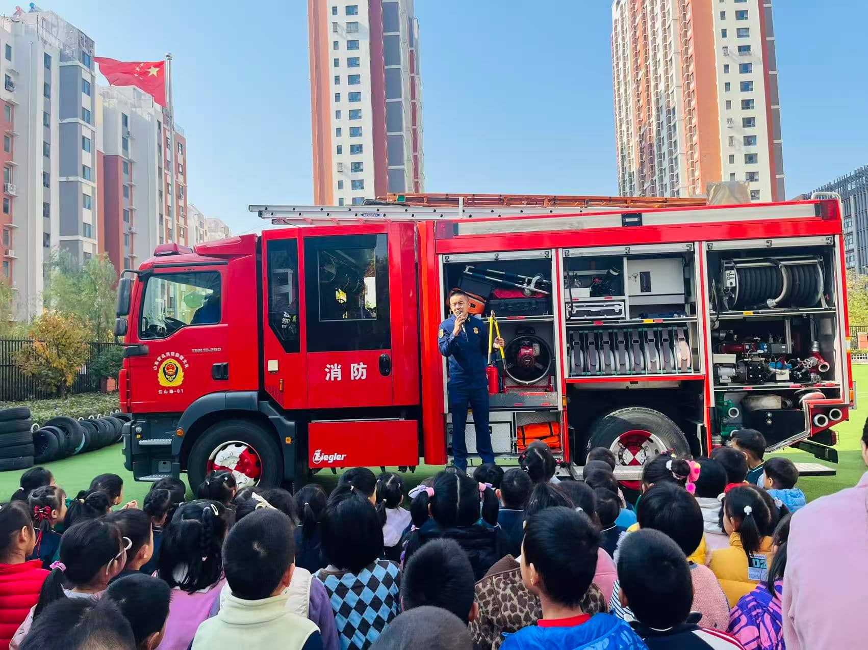 课堂上,消防员叔叔化身“安全老师”,打开精心准备的PPT。屏幕里五颜六色的卡通消防标志、生动有趣的火灾避险小故事,瞬间吸引了孩子们的目光。“红色的‘禁止烟火’标志像小警示灯,看到它就不能玩火哦!”消防员一边指着PPT上的消防器械图片,一边讲解灭火器、消防服的用途,还现场展示了消防员的全套消防装备——当一位“蓝朋友”戴上头盔时,孩子们纷纷睁大眼睛惊呼:“叔叔好像超级英雄!”