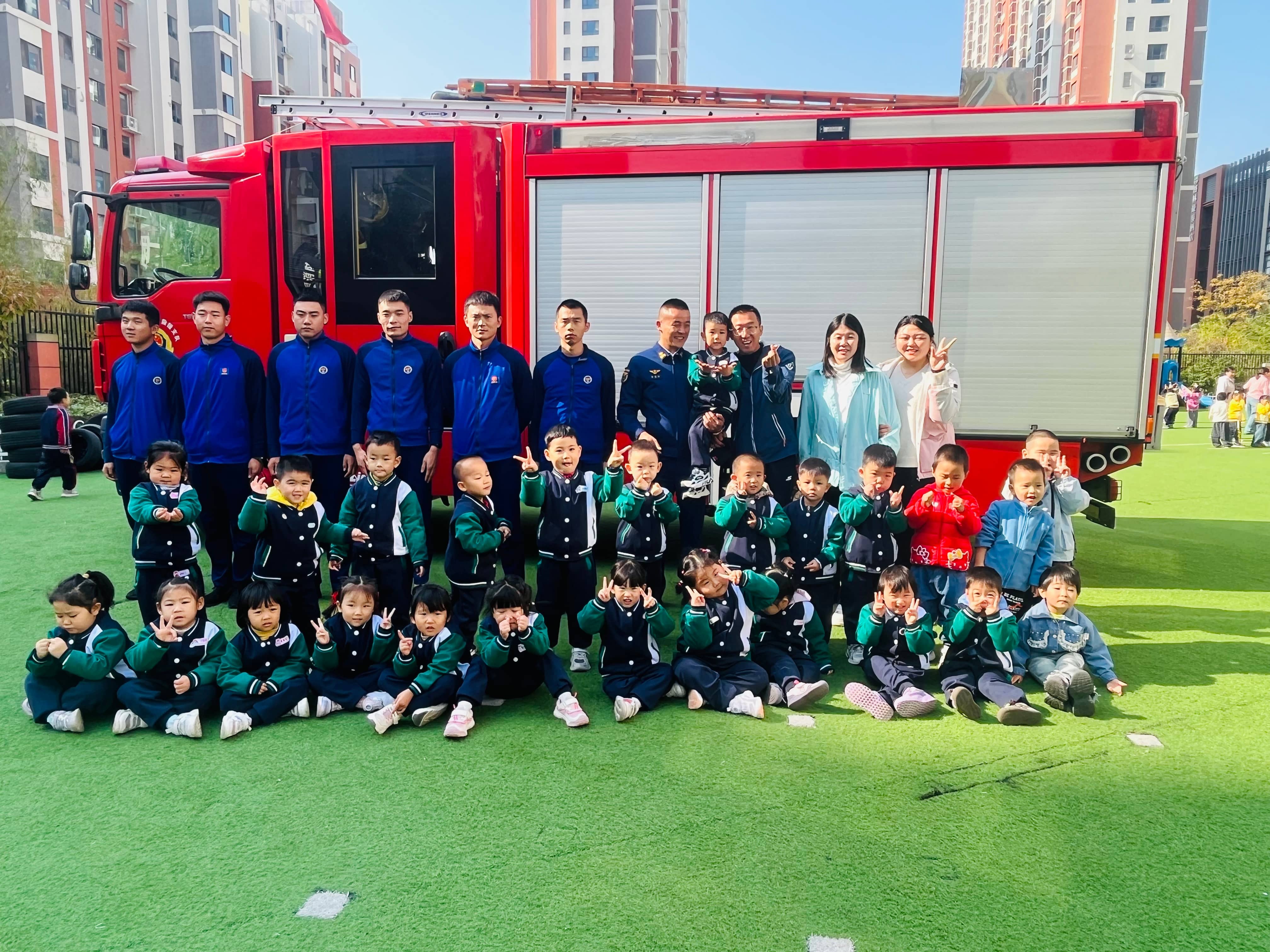 演练结束后,孩子们最期待的“参观消防车”环节如约而至。红色的消防车像“大玩具”一样停在操场,消防员叔叔打开车厢,展示里面的水带、云梯、破拆工具等装备,还邀请胆子大的小朋友轻轻触摸水带。“这个管子好粗呀!”“消防车能装好多水吗?”孩子们围着消防员叽叽喳喳提问,“蓝朋友”们耐心解答,还逐个抱起小朋友坐在消防车上体验,小小的脸上写满了开心与崇拜。
