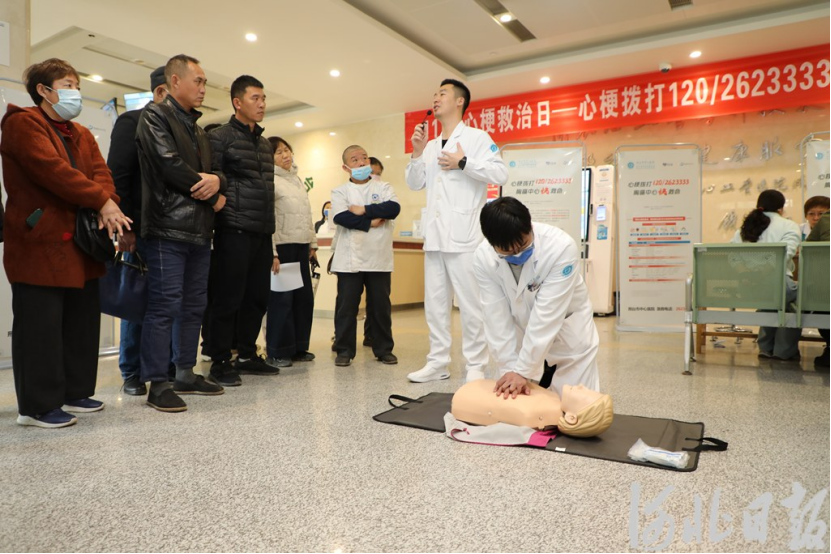 医务人员进行心肺复苏操作演示,指导群众掌握正确的急救动作要领,提高大家对急性心肌梗死的急救和自救能力。现场还摆放了多种心肌梗死防治宣传展架,在公共区域显示屏循环播放2025年“中国心梗救治日”宣传片。