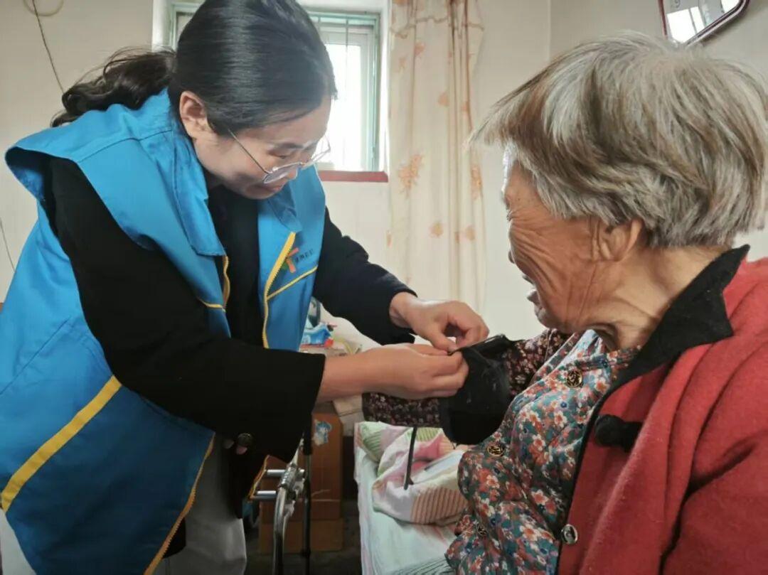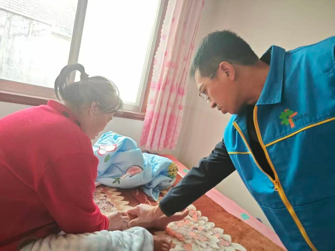 店子西于家的于大姨家。于大姨是因股骨颈骨折行人工股骨头置换术,感人的一幕让所有人动容——听说医护人员要来看她,张大姨早早地就在家门口等候,嘴里不停地说着感谢的话。这份淳朴的真情,让在场的每一位医护工作者都深深感动。