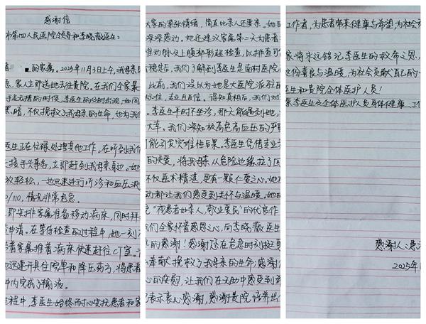 “感谢李医生在危急时刻伸出援手,放下手头工作全力救急!”家属握着李主任的手激动地说。除了沉甸甸的锦旗,带来的感谢信中,更是详细记录了从紧急送医到病情稳定的全过程,字里行间满是对李晓薇主任专业救治、暖心关怀的认可,以及对平度市第四人民医院医疗服务的高度肯定。