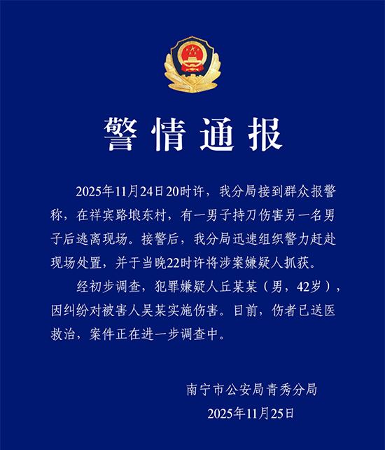 广西南宁通报一起持刀伤害案 头条 2025-11-25 23:07:30 浏览 评论 南宁市公安局青秀分局11月25日通过微信公众号“南宁青秀警方”发布警情通报称: 11月24日20时许,我分局接到群众报警称,在祥宾路埌东村,有一男子持刀伤害另一名男子后逃离现场。接警后,我分局迅速组织警力赶赴现场处置,并于当晚22时许将涉案嫌疑人抓获。 经初步调查,犯罪嫌疑人丘某某(男,42岁),因纠纷对被害人吴某实施伤害。目前,伤者已送医救治,案件正在进一步调查中。 来源:观察者网 上一篇: 公交车上遗落钱物黑包 蒙城公交驾驶员拾金不昧获锦旗 下一篇: 本文地址: http://zx.zpt966033.com/toutiao/1742886.html 版权声明:如无特殊标注,文章均为本站原创,转载时请以链接形式注明文章出处。