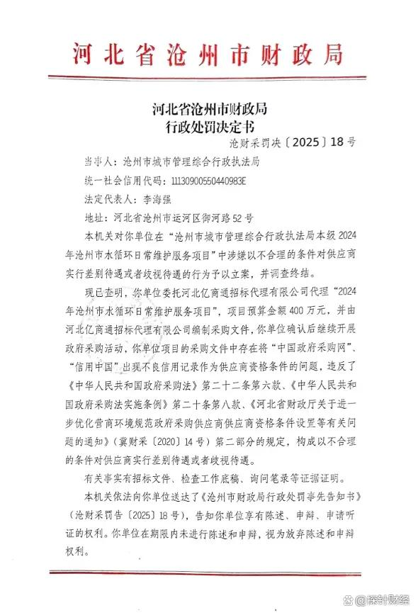 从中国河北政府采购网获悉,2025年11月26日,沧州市财政局发布一则行政处罚决定书,文号为沧财采罚决〔2025〕18号,处罚对象为沧州市城市管理综合行政执法局。