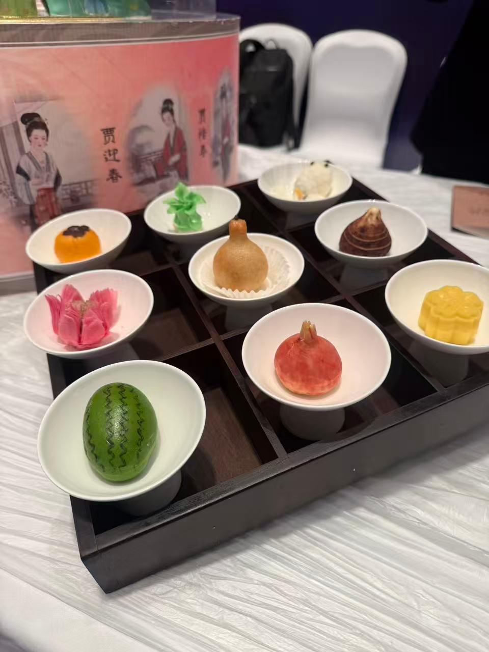 “晴雯包其实是豆腐皮包,因为《红楼梦》里写晴雯喜欢吃这种包子,”武剑辉指着一款精致的点心介绍道,“太君酥则是仿照贾母头上戴的抹额造型,一层层黑芝麻叠加而成。这些点心不仅复刻了书中的描写,更融入了厨师团队对传统文化的理解与创新,柿子造型寓意‘事事如意’,石榴造型象征‘多子多福’。”