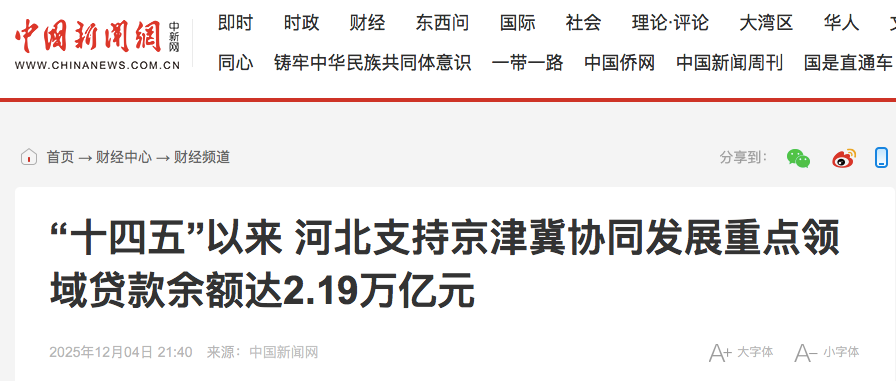中新社石家庄12月4日电(赵丹媚)河北省政府新闻办4日举行“十四五”高质量发展河北答卷系列主题新闻发布会通报,“十四五”以来,河北支持京津冀协同发展重点领域贷款余额达2.19万亿元(人民币,下同),较“十三五”末增长了55.3%。