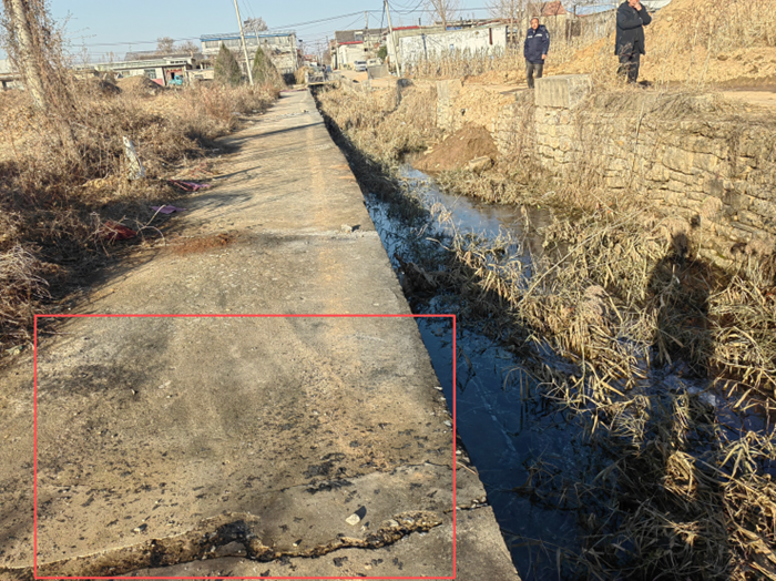 家属指认的被堵塞的河段,已经被挖掘机挖开。记者发现被堵塞的地方系一处东西向通行的简易水泥桥,桥面上还有挖掘机施工时留下的白色痕迹。