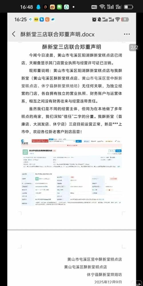12月9日下午,在屯溪酥新堂官方账号上,发布了就此事的说明,发布者为屯溪区酥新堂糕点店等三家店。