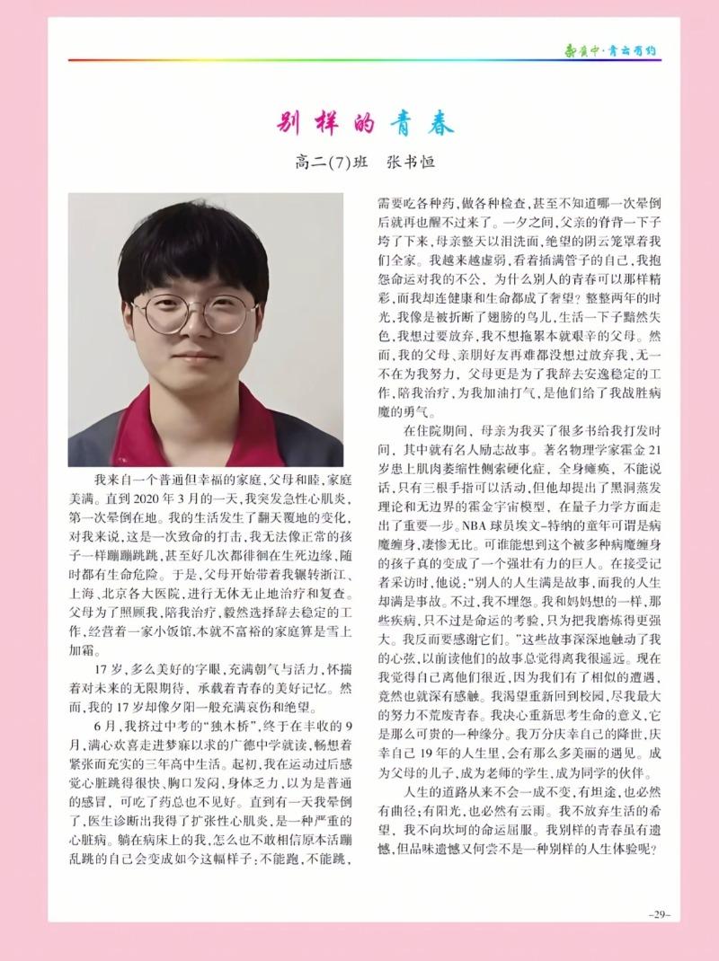 2020年3月,17岁的张书恒还是广德中学一名普通的高一学生。阳光自律、学习刻苦,是老师和家长眼中“不用操心的好学生”。彼时的他,满心憧憬,期待两年后奔向高考那座独木桥,走进心仪的大学。却不曾想,一场突如其来的疾病打破了所有美好。