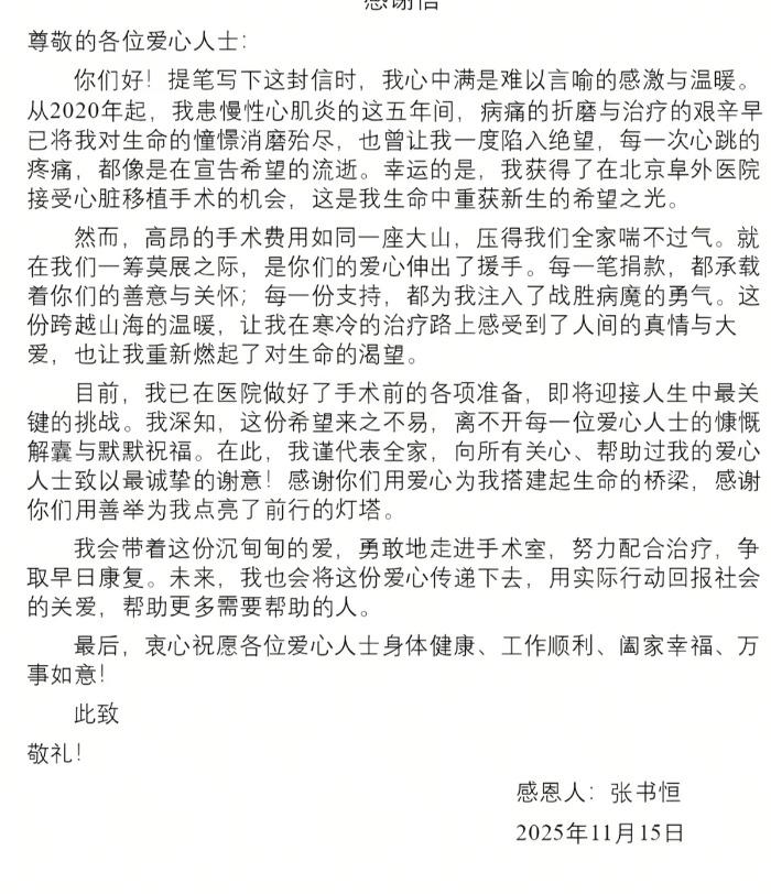 如今,张书恒仍在重症监护室里做着心脏移植最后准备。陈德凤说,她会把每一笔捐款都仔细记录下来,等孩子康复,一定会带着他去一一致谢。“无论最终结果如何,全家都会尽最大努力回馈社会,把这份爱心传递下去。”陈德凤对未来有些忐忑,有些彷徨,但语气仍然坚定。