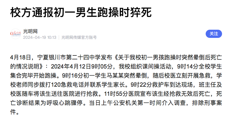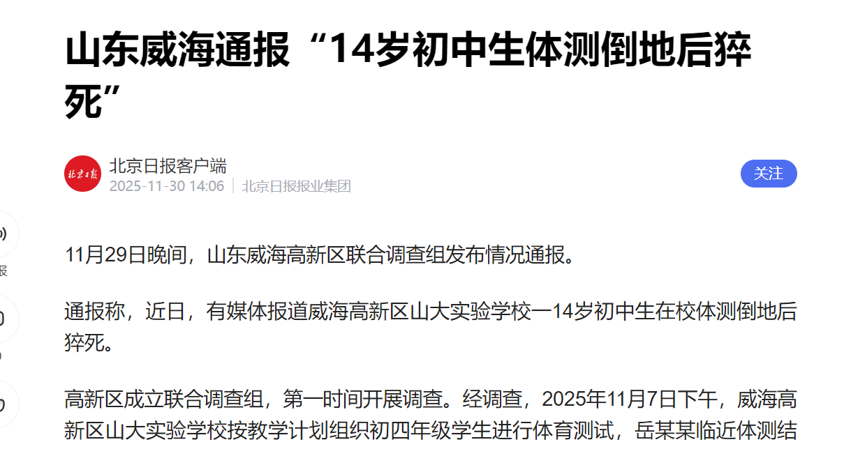 此前,有报道称,山东威海一中学14岁初中生在学校组织的体测中猝死。学生岳红(化名)于11月7日傍晚在学校操场1000米体测过程中突然倒地,经抢救无效不幸离世,系心源性猝死。