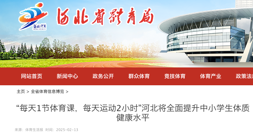 据河北省体育局官网消息,年初,河北省教育厅制定《全面提升中小学生体质健康水平若干措施》,决定自2025年春季新学期起,在全省中小学推行优化课程安排等11条措施,确保学生每天综合体育活动时间不低于2小时。