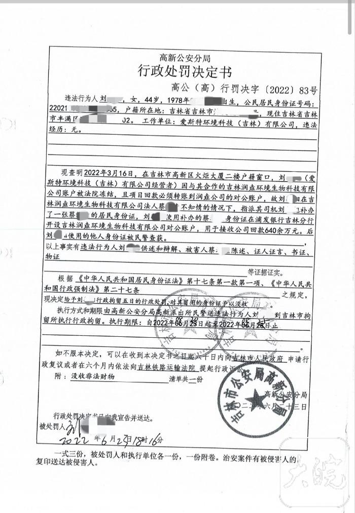 吉林市公安局高新分局出具的《行政处罚决定书》显示,刘某某因润垚公司账户被法院冻结,且项目回款必须转至该公司对公账户,便在蔡女士不知情的情况下,于2022年3月16日,指派司机刘某旭在高新区户籍窗口补办了蔡女士的身份证。刘某某使用该身份证开设润垚公司对公账户,用于接收公司回款640余万元。最终,刘某某被处行政拘留5日的处罚,对其冒用的身份证予以没收。