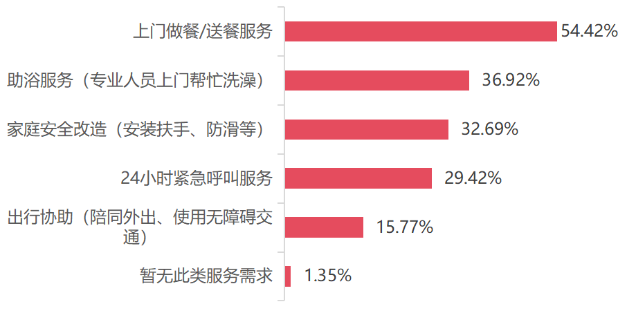 生活照料方面,54.42%的受访者渴望上门做餐/送餐服务,36.92%的受访者关注助浴服务,32.69%的受访者希望进行家庭安全改造,还有29.42%的受访者需要24小时紧急呼叫服务,凸显了对安全便捷居家生活的核心诉求。