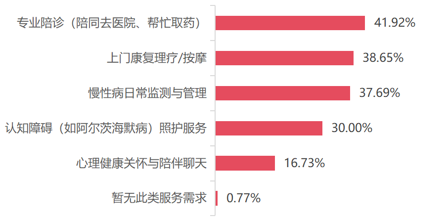 医疗健康领域,专业陪诊服务以41.92%的占比成为“刚需”;上门康复理疗、慢性病管理的需求紧随其后,占比38.65%、37.69%;认知障碍照护服务也有30%的选择率,标志着老年人医疗需求从“有病治病”向“全程健康管理”转变。