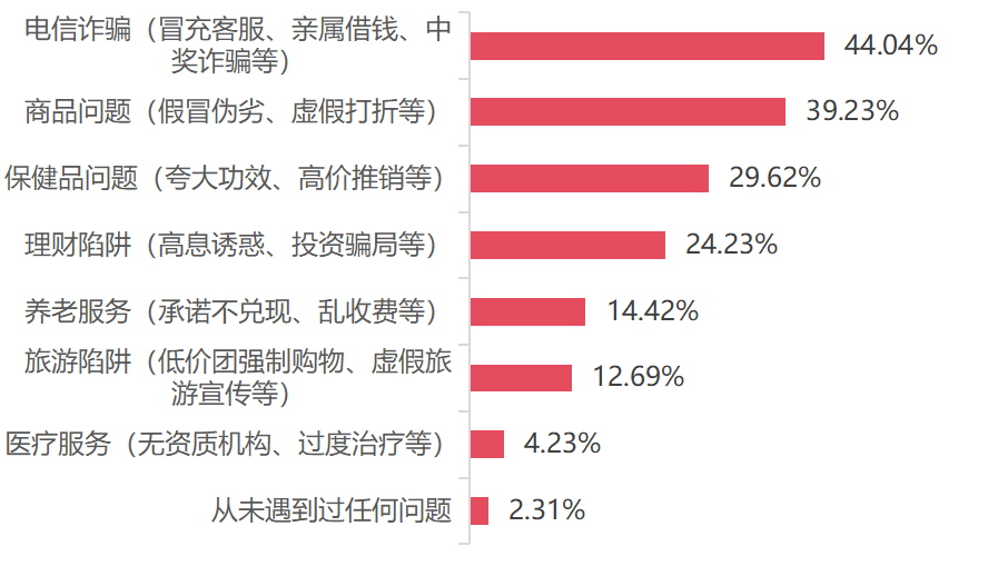 市场繁荣背后的多重痛点仍不容忽视,消费陷阱仍是老年群体的主要威胁。在遭遇过消费陷阱的苏州老年人中,电信诈骗以44.04%的占比居于首位,商品问题、保健品问题、理财陷阱也困扰着相当比例的老年人,分别占比39.23%、29.62%、24.23%,仅有2.31%的老年人表示从未遇到过任何消费问题,凸显出加强老年人消费者权益保护的紧迫性和必要性。