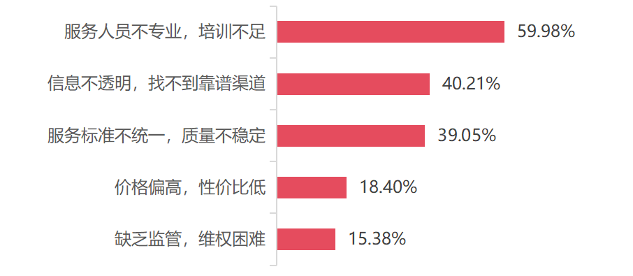服务供给端的短板同样突出。59.98%的受访者认为服务人员不专业、培训不足是当前市场最突出的问题,直接影响服务质量与用户体验;信息不透明、服务标准不统一等现象也让消费者难以放心选择。