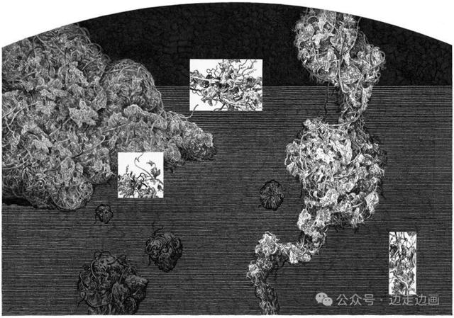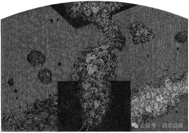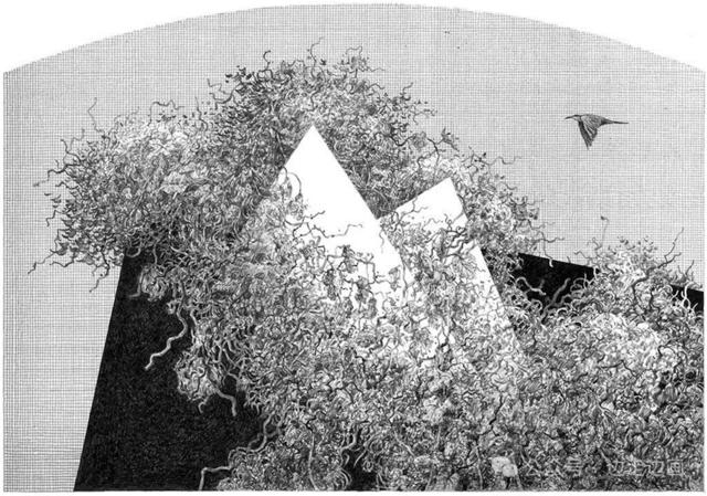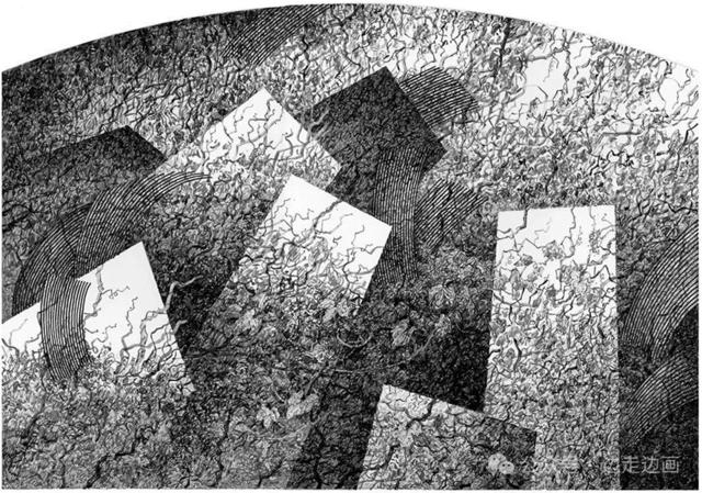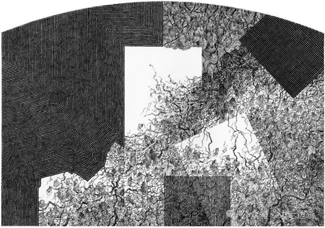 在众多具有探索性的作品中,以夏克梁老师的《枯藤》系列作品为例,其整体风貌呈现出理性与感性并存的特点。一方面,画面中大量运用规则的线条构建出硬朗、理性的抽象形态,以马克笔最质朴的绘画语言营造机械感与秩序感,另一方面又在表现藤蔓、枝叶时运用卷曲、交错的自由笔触,营造出松动、有机的视觉效果,两者相辅相成,张弛有度,各个视觉元素相互重叠、穿插、切割,既具有强烈的设计构成感,又富有即兴趣味。而最大亮点则在于该系列作品一改马克笔绘画色彩丰富的特点,选择以黑白作为核心色调,使其表现方式更为纯粹,可谓不破不立的典范。
