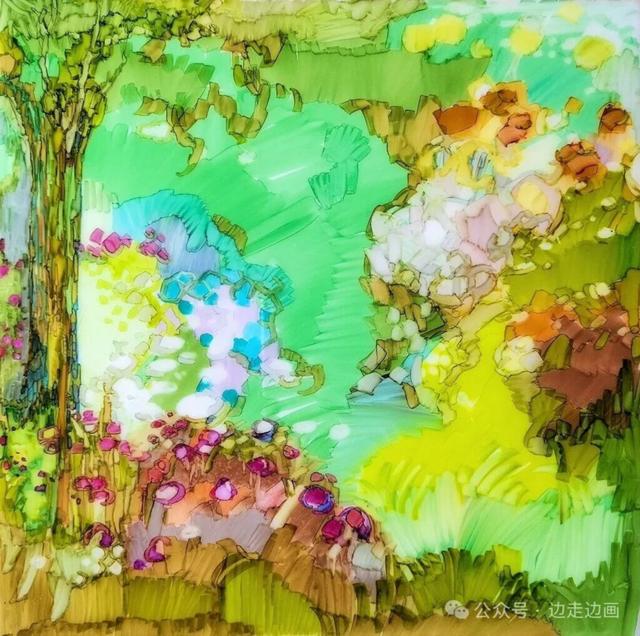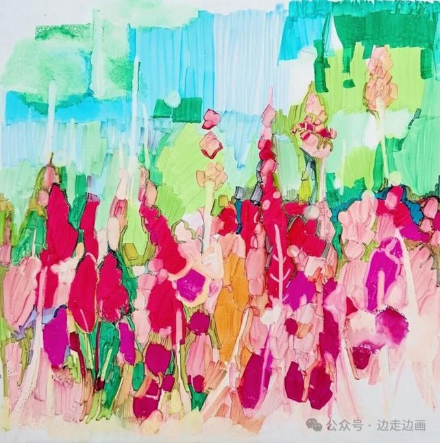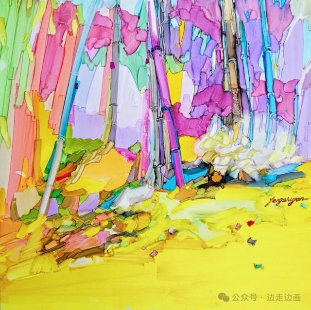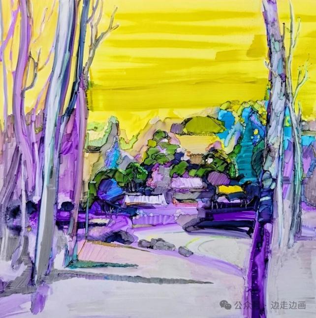 杨世艳老师的《乡野光韵》系列作品同样表现自然景观,但将自然景观拆解为块面与线条的组合,弱化具象轮廓的同时强化形式美感,使马克笔的媒介特性与自然题材的意象相结合。与夏老师作品稳健的黑白对比截然相反,杨老师的色彩运用极具张力,抛弃固有色的客观还原,呈现出表现主义的特征,以高饱和度的黄、绿、玫红、紫等对比色建立起冲突性的画面基调,营造出明快热烈的视觉氛围,同时笔触表现自由且富有肌理感,借助马克笔在PVC版面上的笔触特性,刻意表现一部分交叠和晕染的痕迹,形成丰富的肌理效果,传递出即兴的创作情绪,更体现了马克笔在表现类似题材时惊人的适应能力。