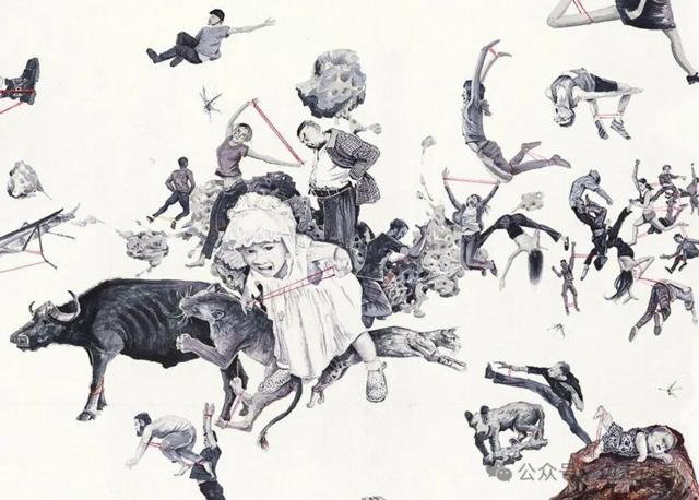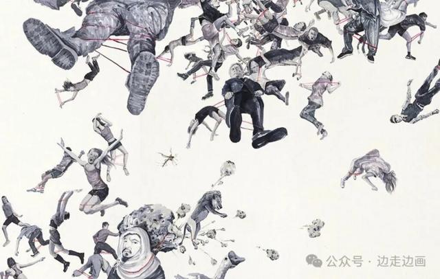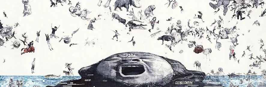 超现实主义同样是马克笔绘画的探索方向之一。以龚栖老师的《呐喊·亢奋期系列No.17》为例,初见本作时,最直观的感受在于尺幅的庞大,以往的马克笔绘画作品普遍采用小幅精细作画,而本作却一反常态地采用了大尺幅,形成了强而有力的视觉冲击。本作的另一大亮点在于宣纸作画,不仅利用了马克笔便于精确控制的特点,还发扬了马克笔作为墨水笔的流动性,画面中既可见干扫枯笔,又可见浓墨色块,颇具趣味。在主题表达方面,本作具有强烈的人文隐喻色彩,使人联想到马格利特作品。底部角色的巨大面庞占据着画面的重心,造型夸张怪诞,上方漂浮的人物、动物形态张扬,形成上散下聚的画面结构,营造出混乱、失重的视觉感受。此外,本作在色彩方面有所取舍,在以蓝、黑为主的低明度主体画面中穿插少量红色线条,形成了强烈的情绪张力,给观众带来紧张与亢奋交织的心理印象,与主题相互呼应。此类超现实主义作品的不断出现,标志着马克笔绘画艺术正在从视觉呈现上升为观念表达。