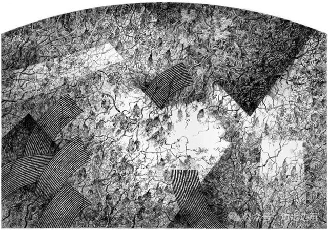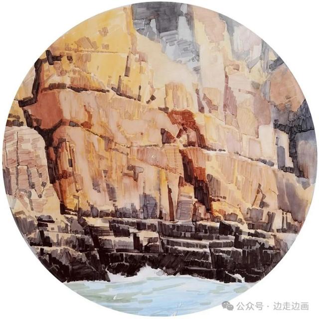 在写实性绘画方面,以任志忠老师的《自然之痕》系列作品为例,其选用的题材相对传统,表现雄伟壮丽的自然景观,画面核心聚焦于岩石的质地和色彩。然而该作并未采用传统风景画的全景式描绘,转而对岩石局部进行特写式刻画,通过这种视角,马克笔的材料特性在特殊媒介表面上得到了充分的发挥。一方面运用厚涂法,塑造了平整的面状结构,体现岩石的坚硬质感,另一方面又以硬朗、短促的块状笔触切割画面,在面之上形成了细密的点、线,笔触的方向和疏密则随岩石的纹理走向灵活变化,结合圆形构图,在整体饱满的情况下不失节奏感,形成了以局部感受整体的视觉效果,实现了与题材的有效结合。