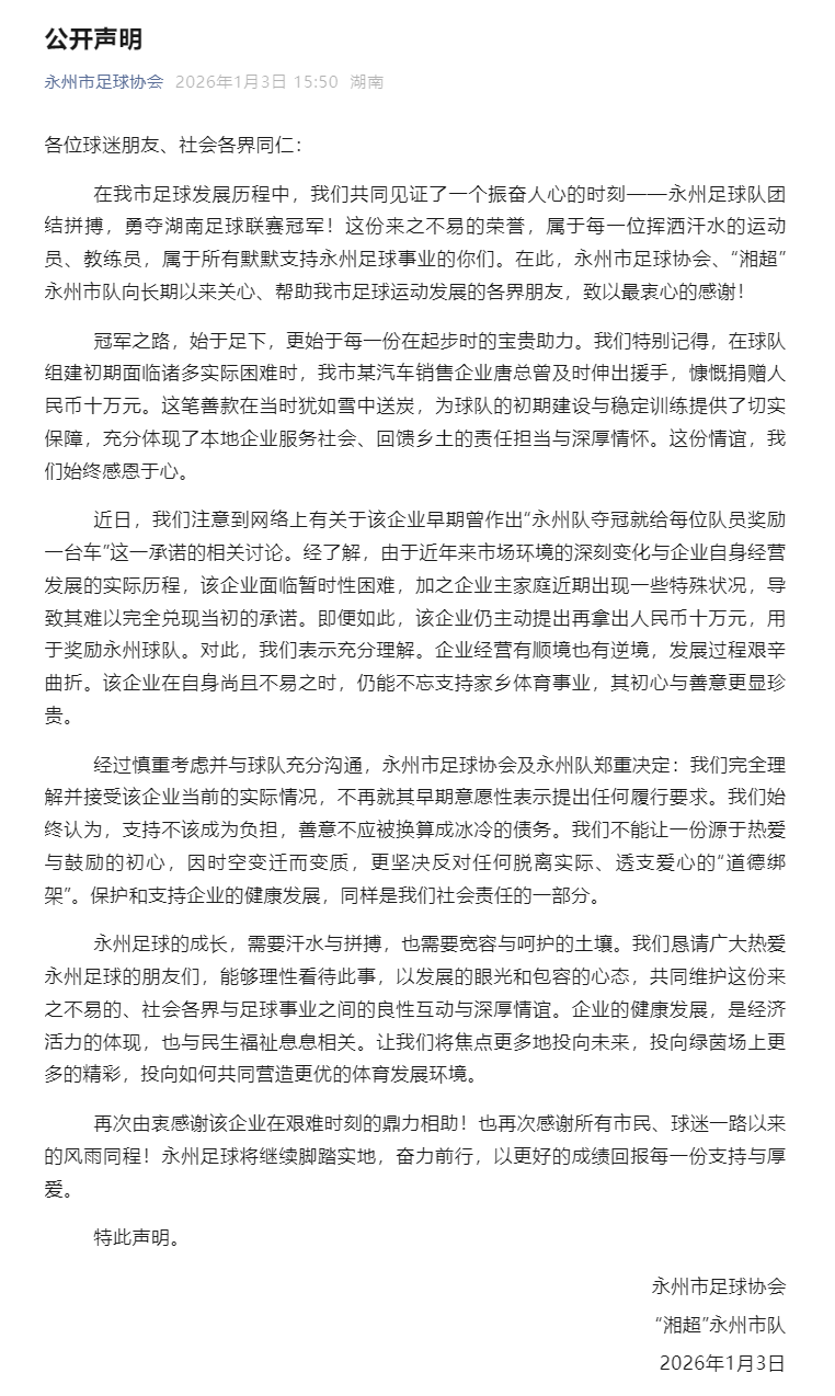 中国网1月3日讯1月3日,永州市足球协会、“湘超”永州市队发布公开声明:近日,我们注意到网络上有关于该企业早期曾作出“永州队夺冠就给每位队员奖励一台车”这一承诺的相关讨论。经了解,由于近年来市场环境的深刻变化与企业自身经营发展的实际历程,该企业面临暂时性困难,加之企业主家庭近期出现一些特殊状况,导致其难以完全兑现当初的承诺。即便如此,该企业仍主动提出再拿出人民币十万元,用于奖励永州球队。对此,我们表示充分理解。企业经营有顺境也有逆境,发展过程艰辛曲折。该企业在自身尚且不易之时,仍能不忘支持家乡体育事业,其初心与善意更显珍贵。