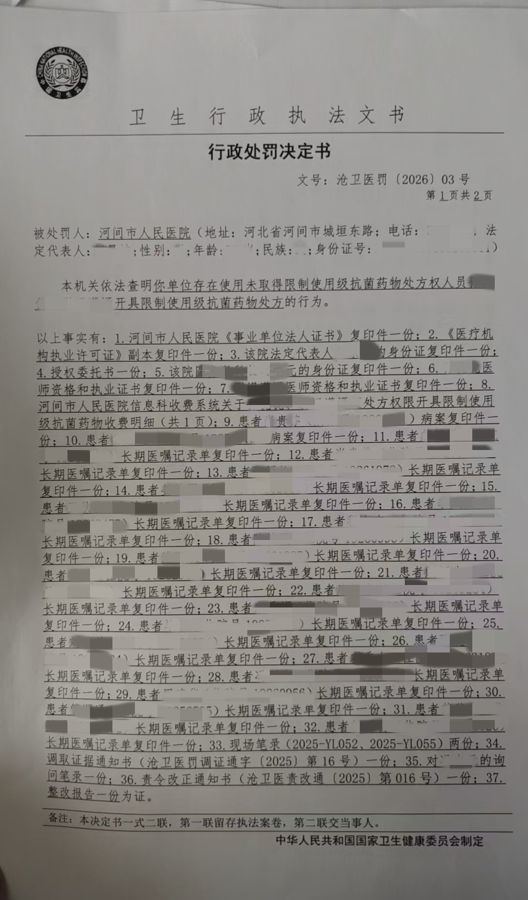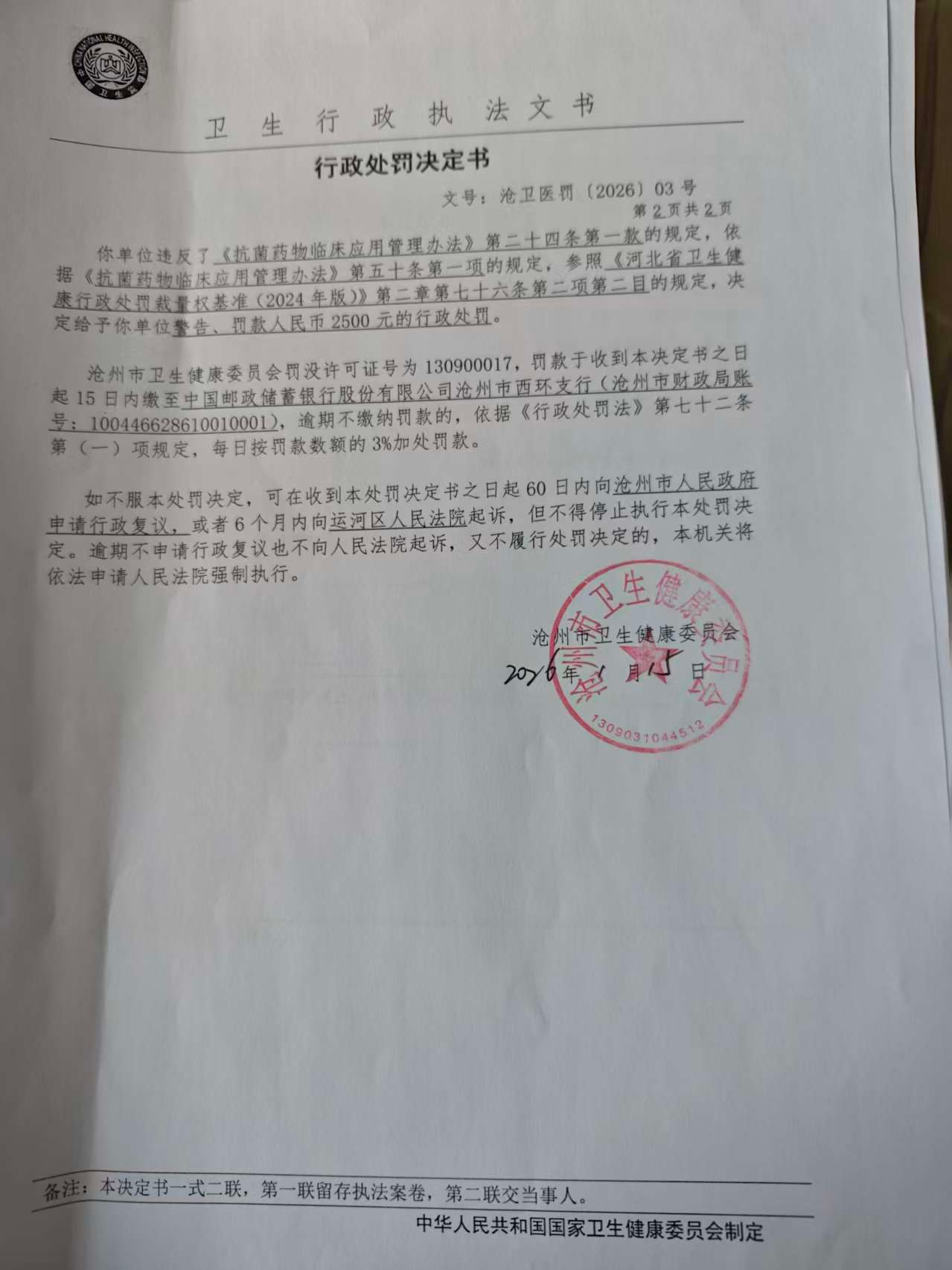 具体来看,文号“沧卫医罚[2026]03号”行政处罚决定书显示,河间市人民医院违反了《抗菌药物临床应用管理办法》第二十四条第一款的规定,依据《抗菌药物临床应用管理办法》第五十条第一项的规定:“医疗机构有下列情形之一的,由县级以上卫生行政部门责令限期改正,给予警告,并可根据情节轻重处以三万元以下罚款;对负有责任的主管人员和其他直接责任人员,可根据情节给予处分:(一)使用未取得抗菌药物处方权的医师或者使用被取消抗菌药物处方权的医师开具抗菌药物处方的;”,参照《河北省卫生健康行政处罚裁量权基准(2024年版)》第二章第七十六条第二项第二目的规定,沧州市卫生健康委员会决定给予河间市人民医院警告、罚款人民币2500元的行政处罚。