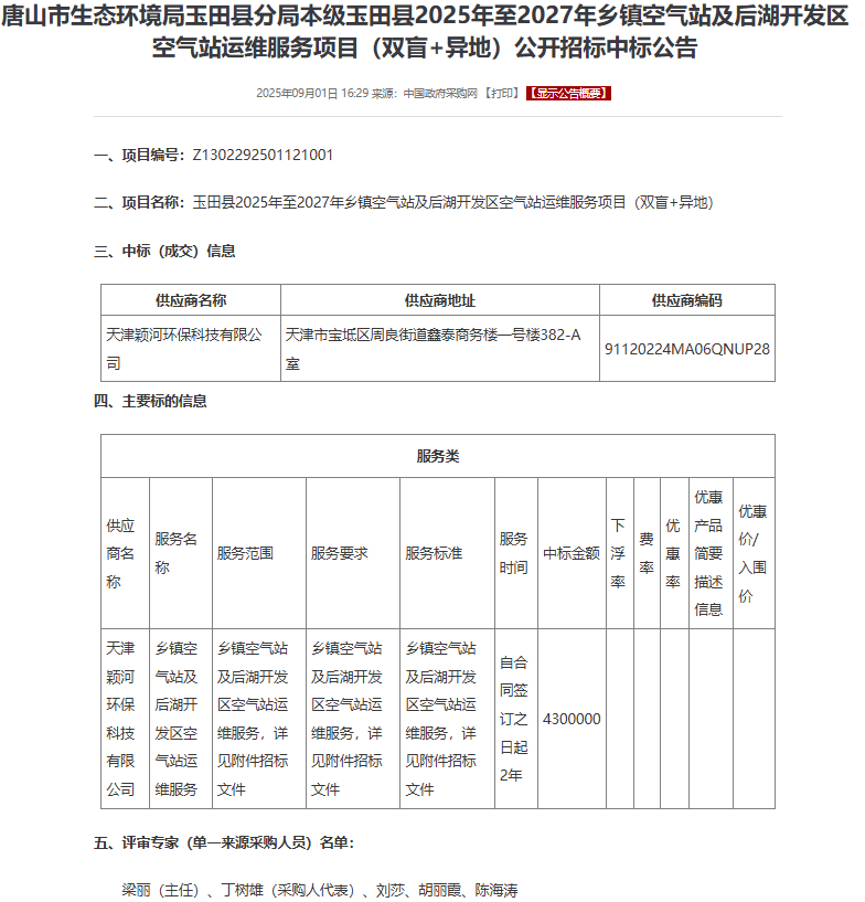 据中国河北政府采购网官网信息,玉田县财政局2026年1月27日发布,因中标供应商天津颖河环保科技有限公司在2025年8月28日参与的唐山市生态环境局玉田县分局“玉田县2025年至2027年乡镇空气站及后湖开发区空气站运维服务项目(双盲 异地)”的政府采购项目投标过程中,存在违规行为。