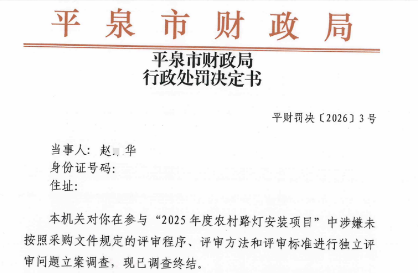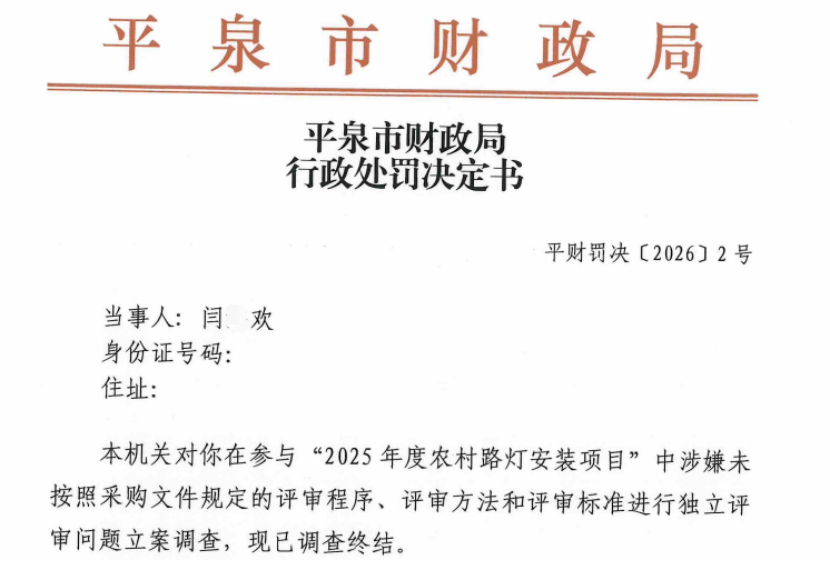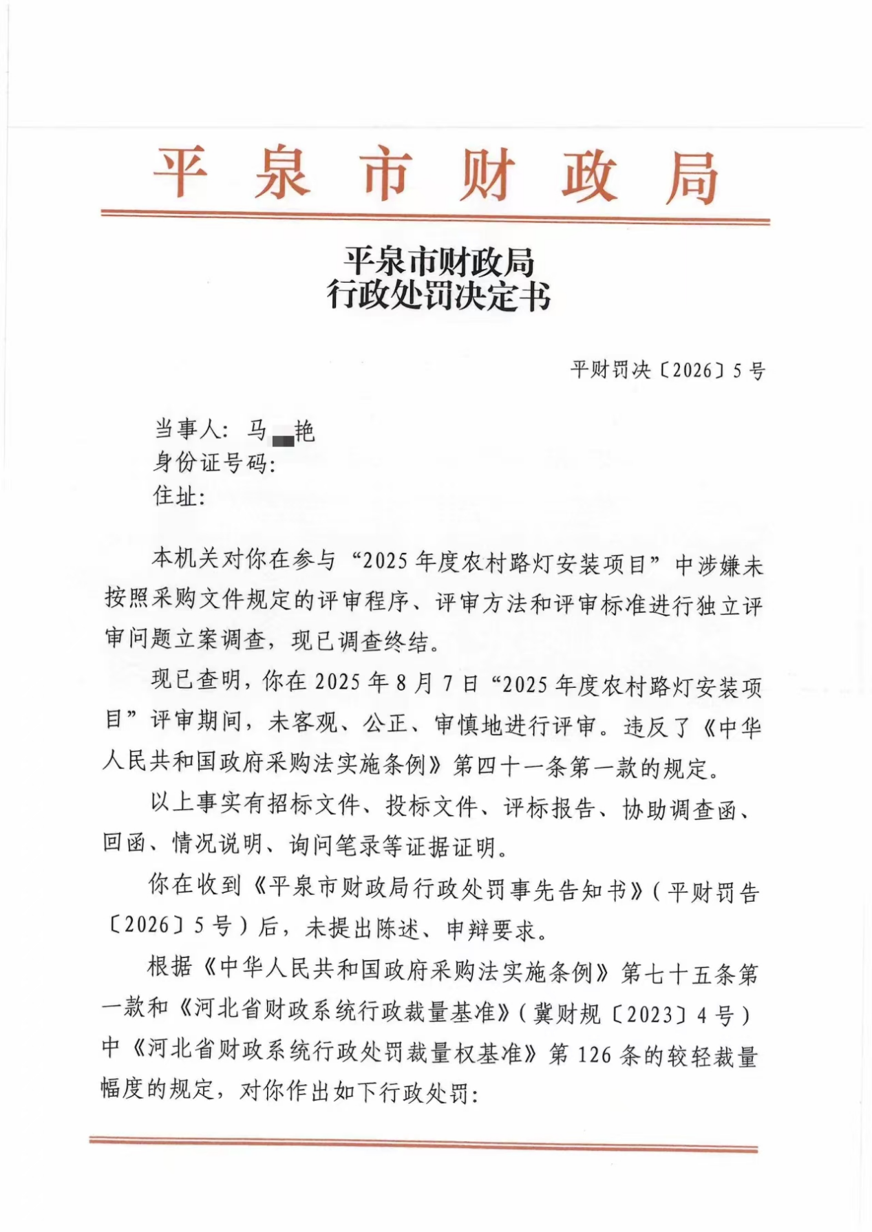 平财罚决〔2026〕1号--5号行政处罚决定书显示,平泉市财政局对王某、闫某欢、赵某华、霍某池、马某艳在参与“2025年度农村路灯安装项目”中涉嫌未按照采购文件规定的评审程序、评审方法和评审标准进行独立评审问题立案调查,现已调查终结。