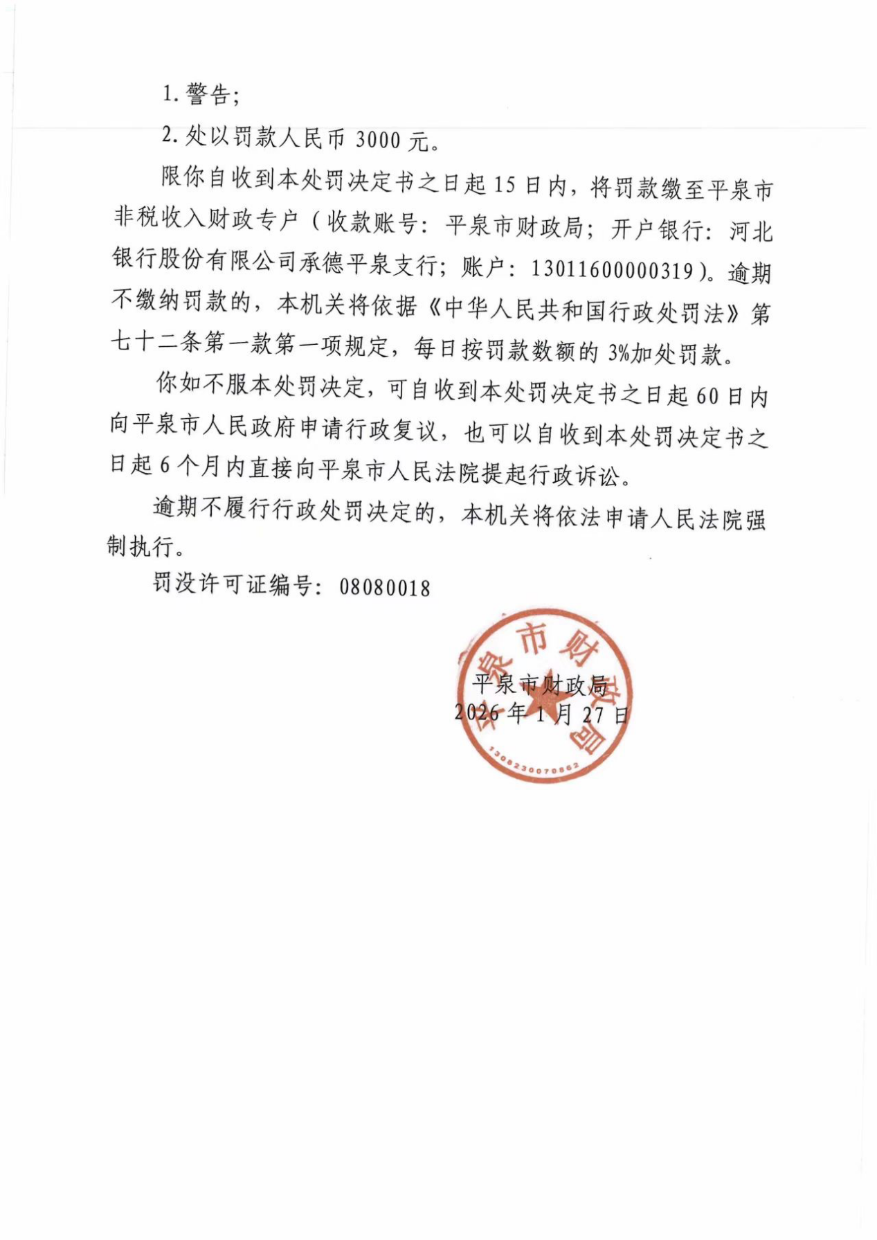 据平泉市财政局处罚文件显示,2026年1月27日,因平泉市农业农村局“2025年度农村路灯安装项目”违规评审,5位评审专家王某、闫某欢、赵某华、霍某池、马某艳均受到平泉市财政局行政处罚,分别被给予警告并处以罚款3000元。