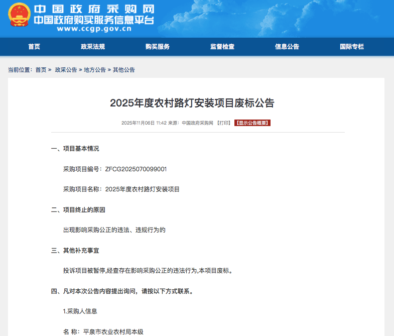 此外,2025年11月6日,中国政府采购网发布了“2025年度农村路灯安装项目废标公告”。公告显示,该项目终止的原因为“出现影响采购公正的违法、违规行为的”。投诉项目被暂停,经查存在影响采购公正的违法行为,该项目废标。