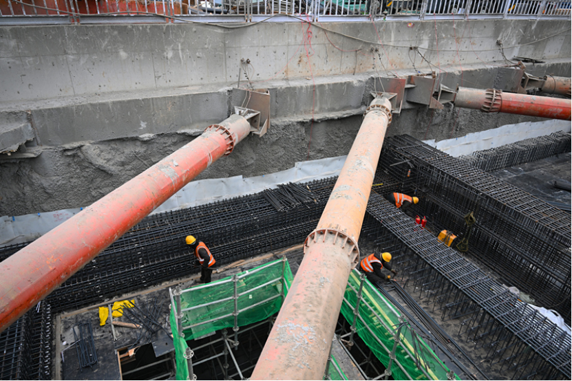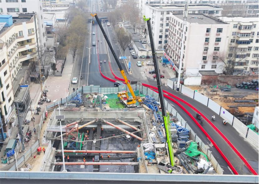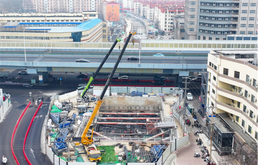 1月29日,中铁二十局集团建设者在石家庄地铁5号线一期工程和平西路站盾构接收井顶板作业现场施工。和平西路站盾构接收井封顶后,将为和平西路站至火车北站盾构接收提供便利条件。