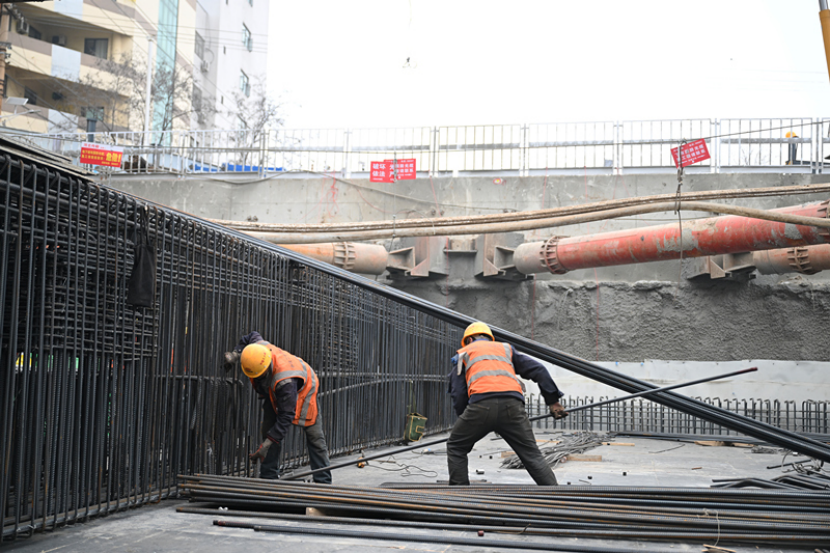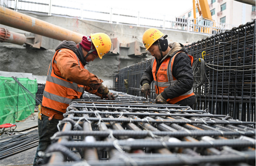 1月29日,中铁二十局集团建设者在石家庄地铁5号线一期工程和平西路站盾构接收井顶板作业现场绑扎钢筋。