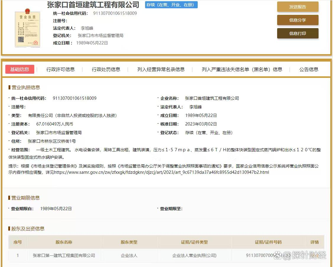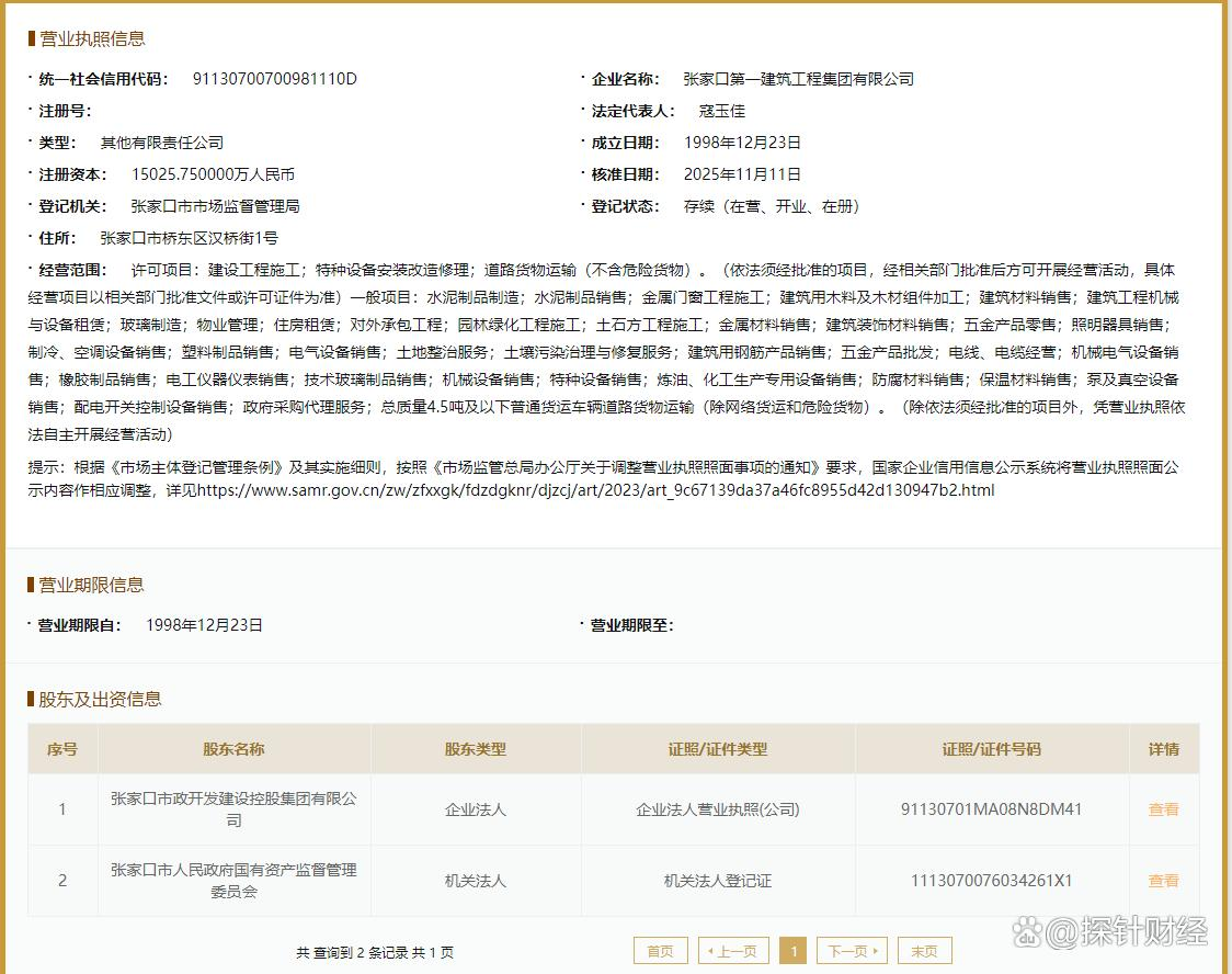 工商信息显示,一建集团成立于1998年12月23日,注册资本达1.5亿元,由张家口市政开发建设控股集团有限公司与张家口市人民政府国有资产监督管理委员会各持股50%,属于国有控股企业,下设十三家分支机构,业务覆盖建筑工程领域等产业链。