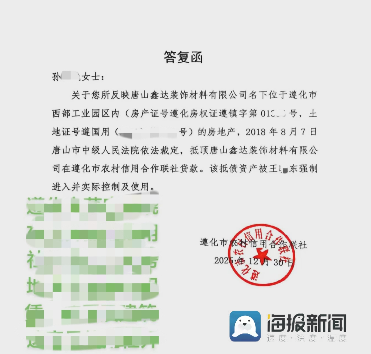 近日,海报新闻记者接到河北遵化市孙女士的报料,遵化市农村信用合作联社(下称“遵化农信社”)对一笔不良贷款处置不当,导致已抵债资产被原借款人继续占用,而她作为担保人之一,长时间受到影响。对此,遵化农信社回应,一直在与当事人积极沟通,但孙女士所述部分内容“与事实不符”。