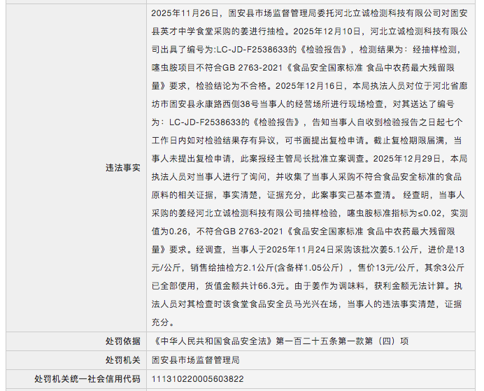 具体来看,文号“固市监处罚﹝2026﹞21号”行政处罚决定书显示,2025年11月26日,固安县市场监督管理局委托河北立诚检测科技有限公司对固安县英才中学食堂采购的姜进行抽检。2025年12月10日,河北立诚检测科技有限公司出具了编号为:LC-JD-F2538633的《检验报告》,检测结果为:经抽样检测,噻虫胺项目不符合GB2763-2021《食品安全国家标准食品中农药最大残留限量》要求,检验结论为不合格。