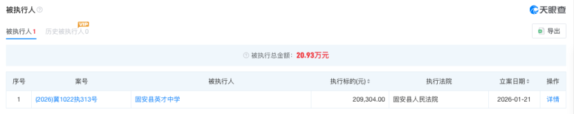 天眼查显示,固安县英才中学,成立于2015年,位于河北省廊坊市固安县,业务范围是“全日制普通高中、初中与小学教育”。该社会组织注册资金5100万元。值得注意的是,该学校目前是被执行人,被执行总金额为20.93万元,立案日期为2026年1月21日,执行法院为固安县人民法院,案号为(2026)冀1022执313号。