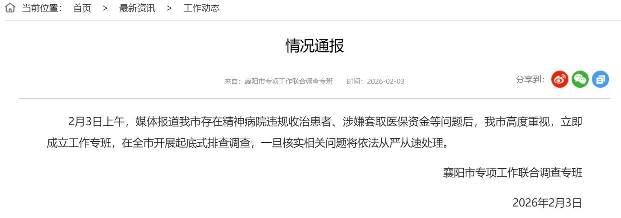 2月3日,湖北省襄阳市卫健委网站发布情况通报。通报称,当天上午,媒体报道我市存在精神病院违规收治患者、涉嫌套取医保资金等问题后,我市高度重视,立即成立工作专班,在全市开展起底式排查调查,一旦核实相关问题将依法从严从速处理。