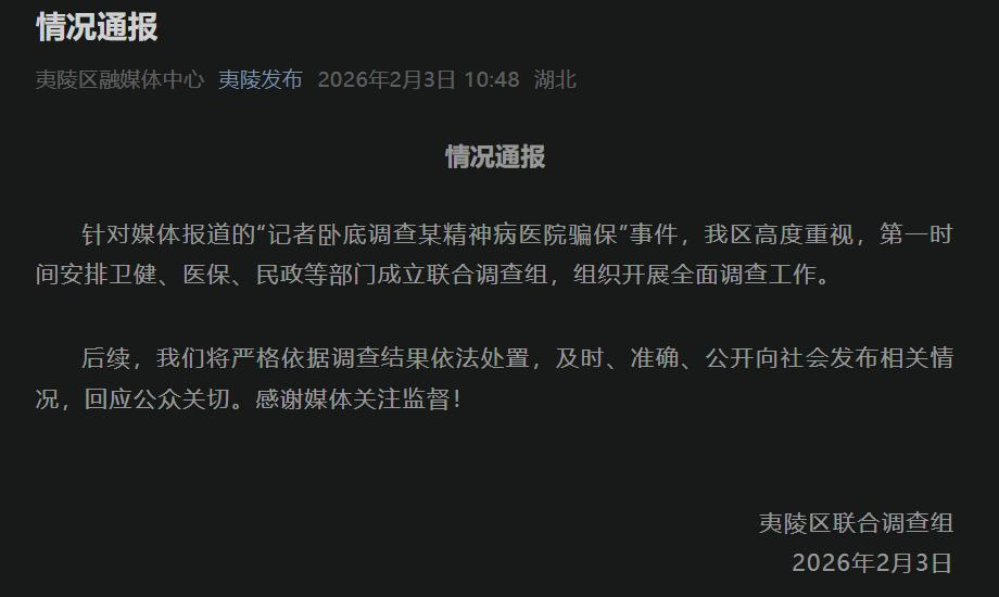 同日,夷陵区联合调查组也通过“夷陵发布”微信公号发布情况通报,表示针对媒体报道的“记者卧底调查某精神病医院骗保”事件,我区高度重视,第一时间安排卫健、医保、民政等部门成立联合调查组,组织开展全面调查工作。后续,我们将严格依据调查结果依法处置,及时、准确、公开向社会发布相关情况,回应公众关切。感谢媒体关注监督!