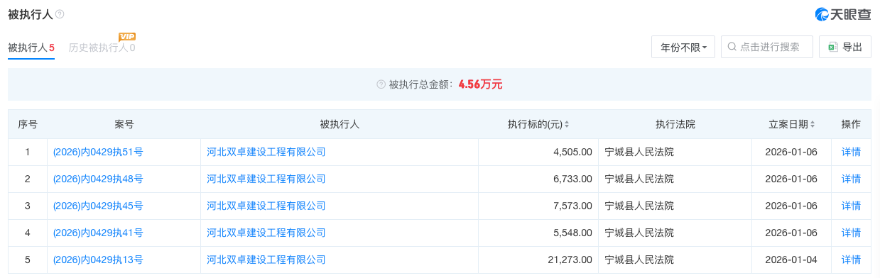 另据天眼查,河北双卓建设工程有限公司,成立于2006年,位于河北省邯郸市,核心业务覆盖房屋建筑、市政公用、公路工程及环保工程等多领域施工服务。企业注册资本5006万元。目前该公司是被执行人,被执行总金额4.56万元,执行法院均为宁城县人民法院。