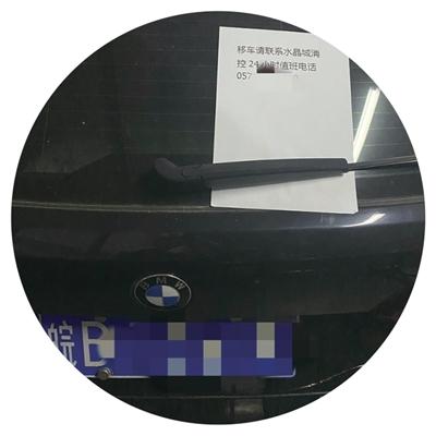 这是一辆黑色宝马X5,停在车库地面通道上的非停车位,由于停的时间比较长,水晶城管理方用7块围挡将车周围全部拦起来,用锁锁住,车子的前挡玻璃和后挡玻璃上都贴了提示牌,上面写着:“移车请联系水晶城消控”,并附着消控值班电话号码。