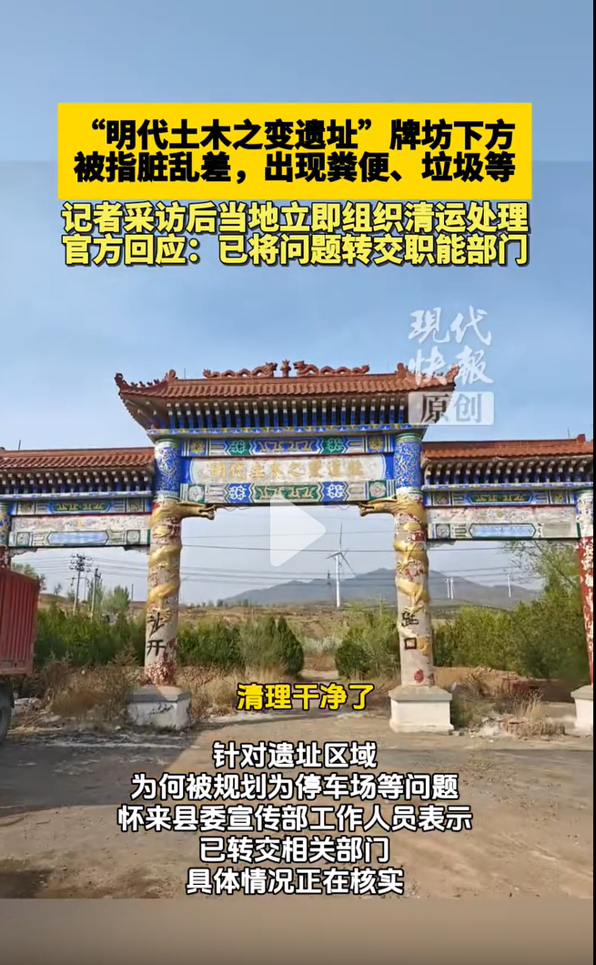 近日,有群众反映,河北省张家口市怀来县“明代土木之变遗址”牌坊下方出现不少粪便、垃圾,还停放着大型货车,让人感觉历史遗址沦为了“公厕”与停车场,希望相关部门加强管理、重视文物保护。